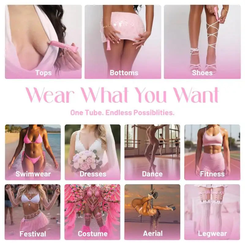2.Allow 30-60s for the adhesive to air-dry and get tacky, then press clothing onto skin. Hold to allow the adhesive to set with the material.